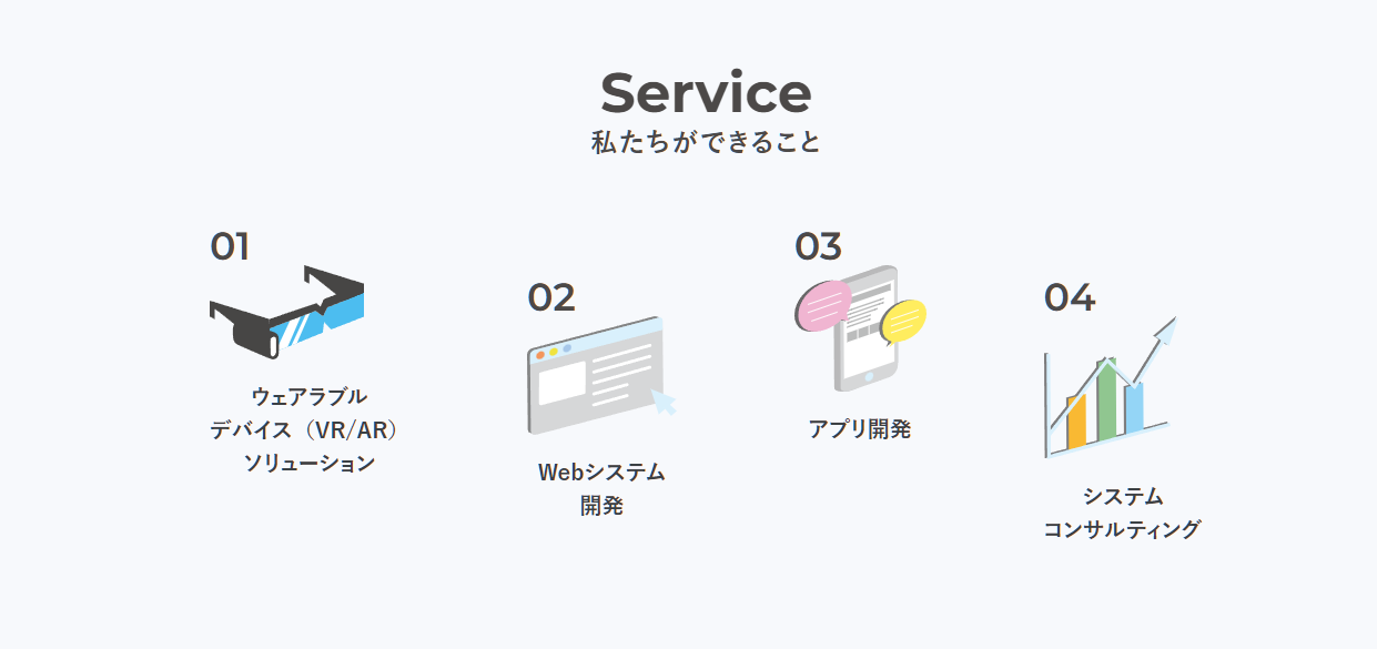 「何ができる会社か」という軸がなく、案件情報がそのまま並んでいる状態だった。個別の実績を横断して読み込み、提供しているサービスの種別を軸に共通するパターンを抽出。開発・保守・コンサルといった切り口でケイパビリティを整理し、会社の強みが一目で伝わる構成へと組み替えた。何を足すかではなく、何として見せるかを決める作業だった。特にウェアラブルデバイスソリューションへの強みを開発などのサービス種別から独立させることで強調した。